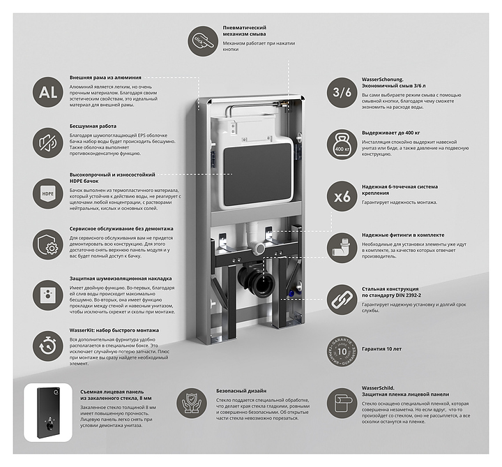 Система инсталляции Wasserkraft Naab 86TLT.040.PE.BL предназначена для установки подвесных унитазов. Внешняя рама выполнена из алюминия, съемная лицевая панель - из закаленного стекла. Комплектация: