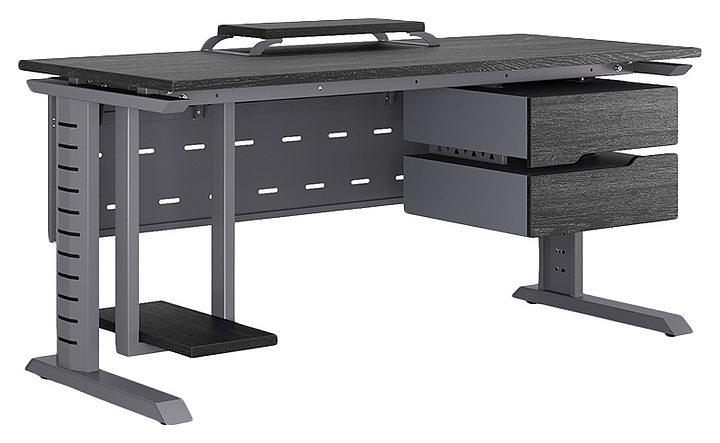 Офисный стол Кобор L2-160/70 graphite/glazed используется в офисных помещениях и кабинетах руководителей. Модель оснащена L-образными опорами с декоративными вставками на боковинах. Каркас выполнен из металла, выкрашенного в цвет графит муар (RAL7024), столешница – из ламинированной древесно-стружечной плиты (ЛДСП) цвета черный дуб (H3178 ST37). Опции (заказываются отдельно):