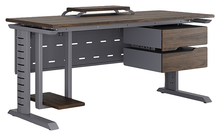 Офисный стол Кобор L2-180/60 graphite/charlston используется в офисных помещениях и кабинетах руководителей. Модель оснащена L-образными опорами с декоративными вставками на боковинах. Каркас выполнен из металла, выкрашенного в цвет графит муар (RAL7024), столешница – из ламинированной древесно-стружечной плиты (ЛДСП) цвета дуб чарльстон (H3154 ST36). Опции (заказываются отдельно):
