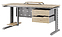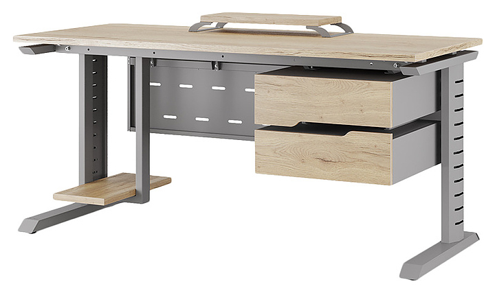 Офисный стол Кобор L2-140/70 aluminum/natural используется в офисных помещениях и кабинетах руководителей. Модель оснащена L-образными опорами с декоративными вставками на боковинах. Каркас выполнен из металла, выкрашенного в цвет алюминиевый металлик (RAL9006), столешница – из ламинированной древесно-стружечной плиты (ЛДСП) цвета натуральный дуб (H1180 ST37). Опции (заказываются отдельно):