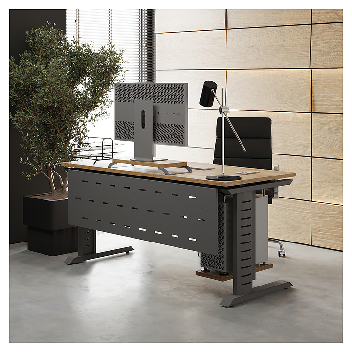 Офисный стол Кобор L2-140/80 aluminum/natural используется в офисных помещениях и кабинетах руководителей. Модель оснащена L-образными опорами с декоративными вставками на боковинах. Каркас выполнен из металла, выкрашенного в цвет алюминиевый металлик (RAL9006), столешница – из ламинированной древесно-стружечной плиты (ЛДСП) цвета натуральный дуб (H1180 ST37). Опции (заказываются отдельно):