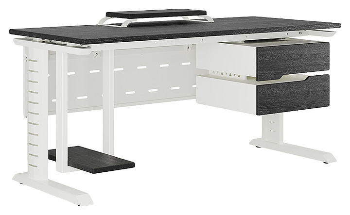 Офисный стол Кобор L2-120/80 white/glazed используется в офисных помещениях и кабинетах руководителей. Модель оснащена L-образными опорами с декоративными вставками на боковинах. Каркас выполнен из металла, выкрашенного в цвет белый муар (RAL9016), столешница – из ламинированной древесно-стружечной плиты (ЛДСП) цвета черный дуб (H3178 ST37). Опции (заказываются отдельно):
