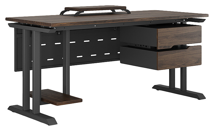 Офисный стол Кобор T-160/80 black/charlston используется в офисных помещениях и кабинетах руководителей. Модель оснащена T-образными опорами. Каркас выполнен из металла, выкрашенного в цвет черный муар (RAL9005), столешница – из ламинированной древесно-стружечной плиты (ЛДСП) цвета дуб чарльстон (H3154 ST36). Опции (заказываются отдельно):