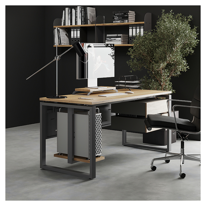 Офисный стол Кобор O1-120/80 aluminum/natural используется в офисных помещениях и кабинетах руководителей. Модель оснащена O-образными опорами. Каркас выполнен из металла, выкрашенного в цвет алюминиевый металлик (RAL9006), столешница – из ламинированной древесно-стружечной плиты (ЛДСП) цвета натуральный дуб (H1180 ST37). Опции (заказываются отдельно):