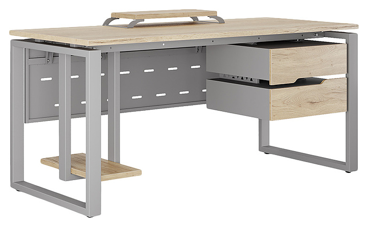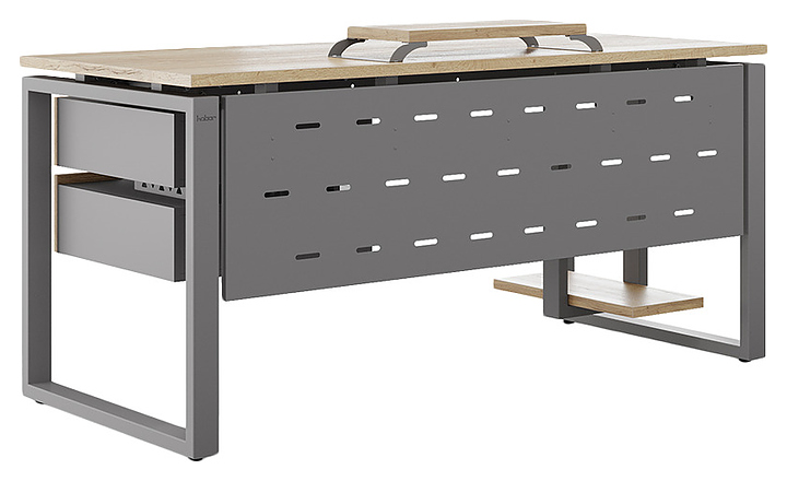 Офисный стол Кобор O1-140/80 aluminum/natural используется в офисных помещениях и кабинетах руководителей. Модель оснащена O-образными опорами. Каркас выполнен из металла, выкрашенного в цвет алюминиевый металлик (RAL9006), столешница – из ламинированной древесно-стружечной плиты (ЛДСП) цвета натуральный дуб (H1180 ST37). Опции (заказываются отдельно):