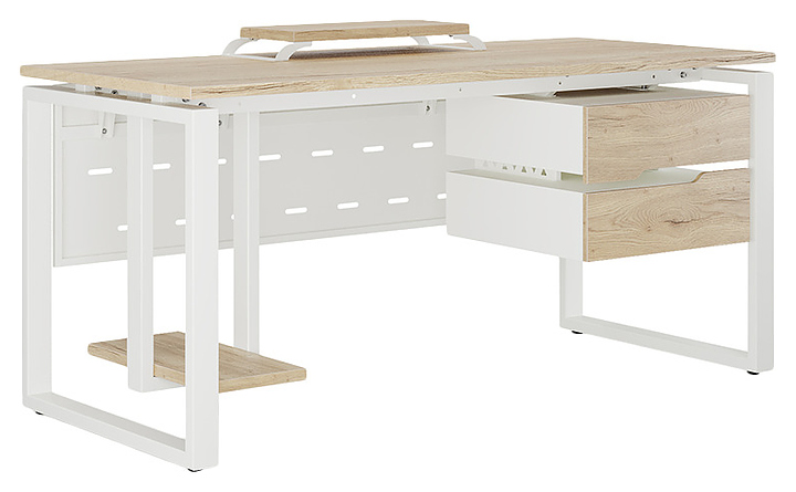 Офисный стол Кобор O1-160/60 white/natural используется в офисных помещениях и кабинетах руководителей. Модель оснащена O-образными опорами. Каркас выполнен из металла, выкрашенного в цвет белый муар (RAL9016), столешница – из ламинированной древесно-стружечной плиты (ЛДСП) цвета натуральный дуб (H1180 ST37). Опции (заказываются отдельно):