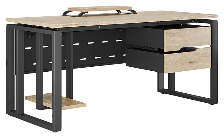 Офисный стол Кобор O2-100/70 black/natural используется в офисных помещениях и кабинетах руководителей. Модель оснащена усиленными вертикальной балкой O-образными опорами. Каркас выполнен из металла, выкрашенного в цвет черный муар (RAL9005), столешница – из ламинированной древесно-стружечной плиты (ЛДСП) цвета натуральный дуб (H1180 ST37). Опции (заказываются отдельно):