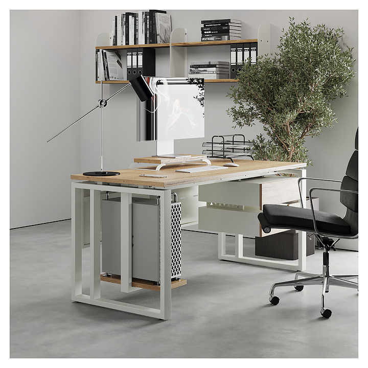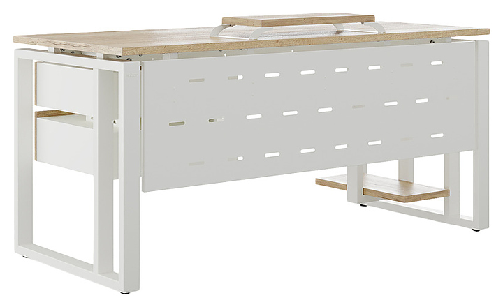 Офисный стол Кобор O2-120/70 white/natural используется в офисных помещениях и кабинетах руководителей. Модель оснащена усиленными вертикальной балкой O-образными опорами. Каркас выполнен из металла, выкрашенного в цвет белый муар (RAL9016), столешница – из ламинированной древесно-стружечной плиты (ЛДСП) цвета натуральный дуб (H1180 ST37). Опции (заказываются отдельно):