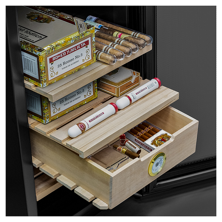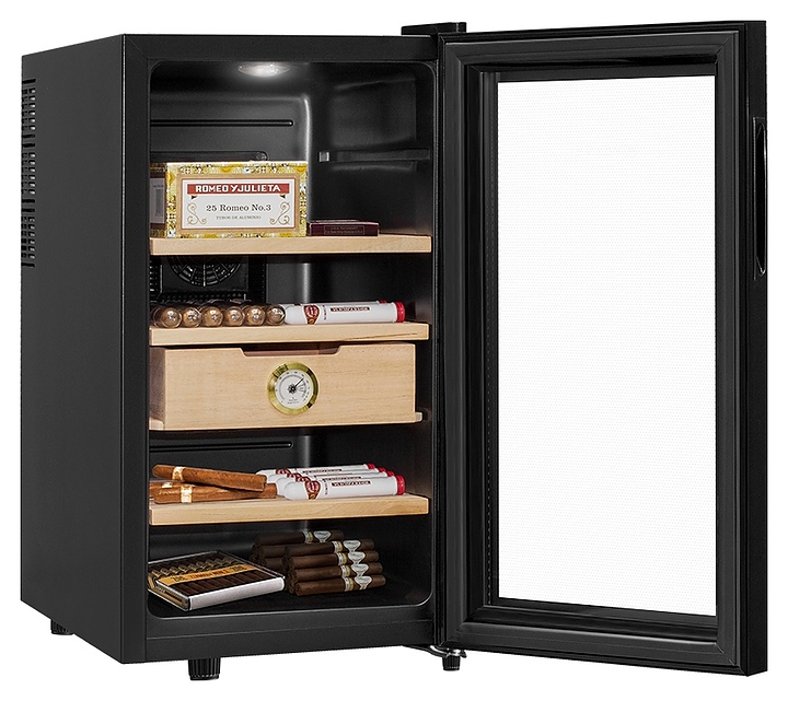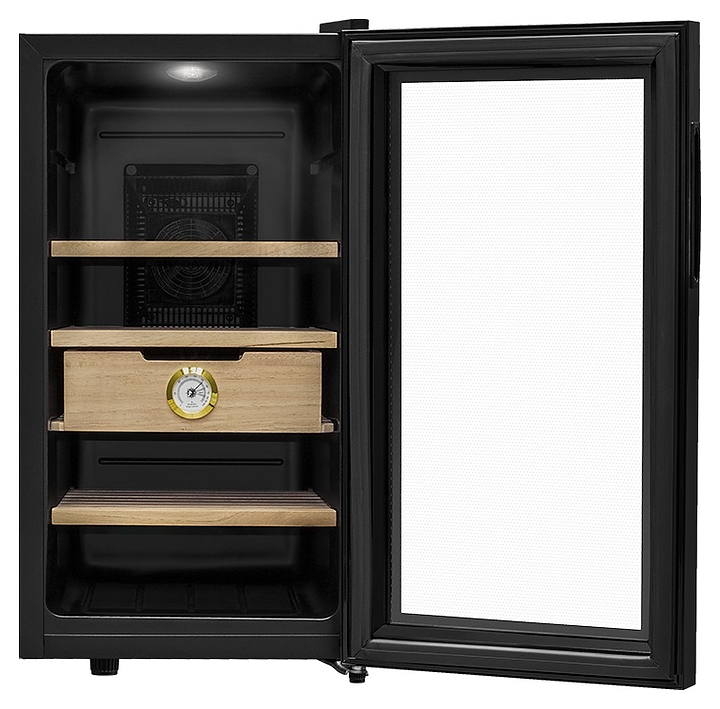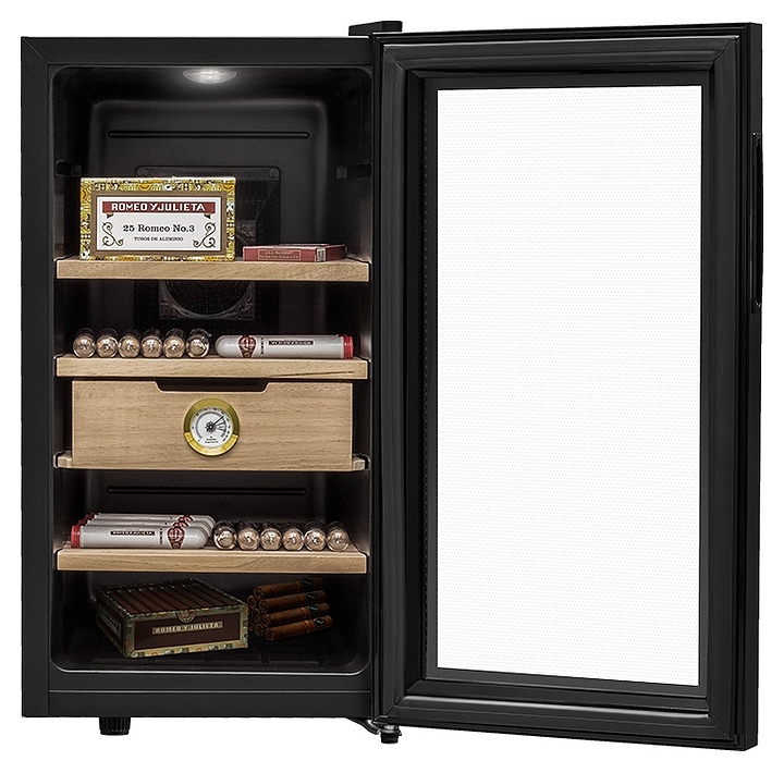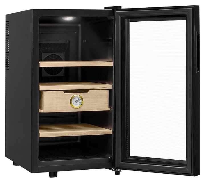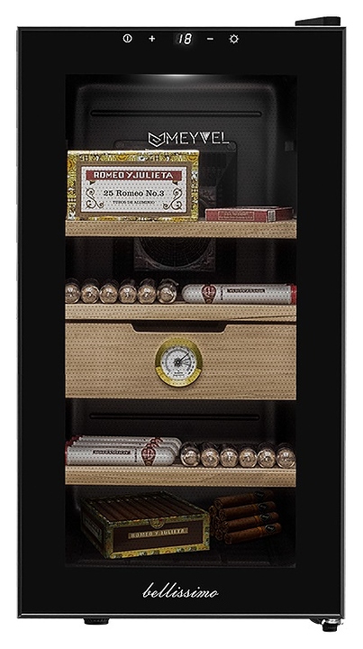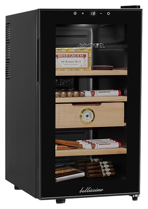 Сигарный шкаф MEYVEL MC-48BT предназначен для хранения в оптимальных условиях и демонстрации табачных изделий в специализированных магазинах, гостиницах, складских помещениях, а также домашних условиях. Модель оснащена распашной дверью на внешних петлях и сенсорной панелью управления с цифровым дисплеем. Копрус выполнен из стали с антикоррозийным покрытием черного цвета, рама двери – из черного пластика, полки и ящик – из массива древесины испанского кедра. В комплект поставки входят 3 выдвижные полки и ящик, резервуар для воды и инструкция по эксплуатации. Особенности: