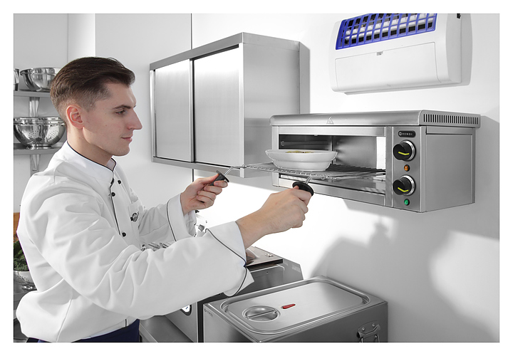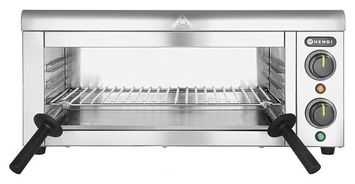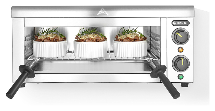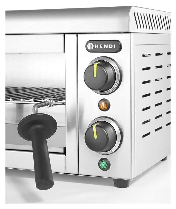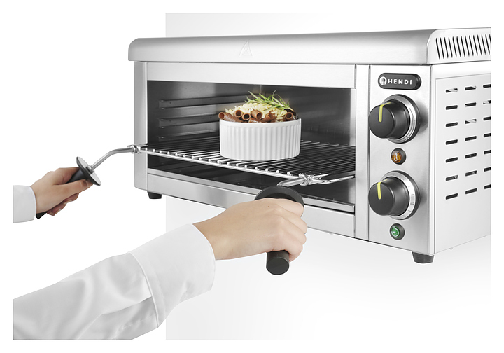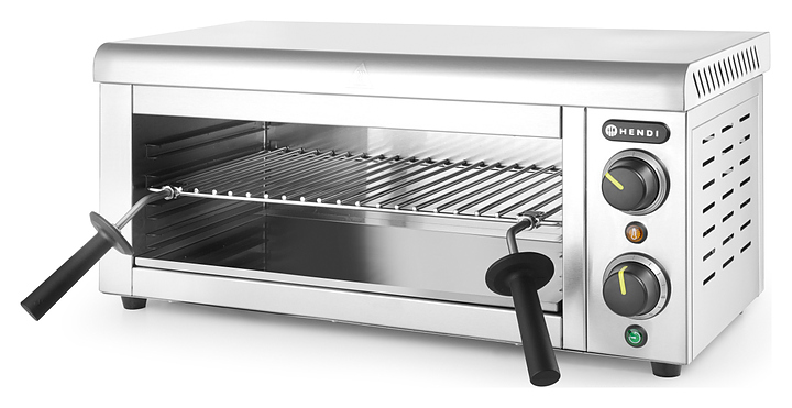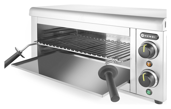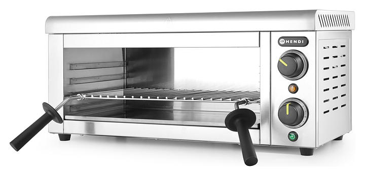 Гриль-саламандер HENDI 264119 предназначен для жарки мяса, птицы, рыбы, овощей, приготовления сендвичей и запеканок, а также быстрого разогрева полуфабрикатов на предприятиях общественного питания и торговли. Модель оснащена решеткой с изолированными ручками, термостатом, индикатором температуры, поддоном для сбора крошек и устойчивыми ножками. Изделие выполнено из нержавеющей стали. Особенности:
