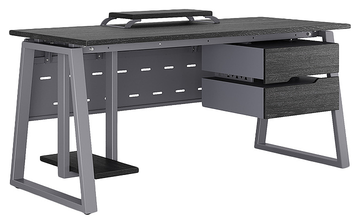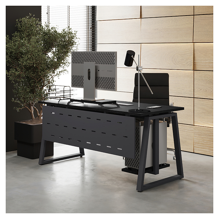 Офисный стол Кобор TR-180/80 graphite/glazed используется в офисных помещениях и кабинетах руководителей. Модель оснащена опорами в форме трапеции. Каркас выполнен из металла, выкрашенного в цвет графит муар (RAL7024), столешница – из ламинированной древесно-стружечной плиты (ЛДСП) цвета черный дуб (H3178 ST37). Опции (заказываются отдельно):