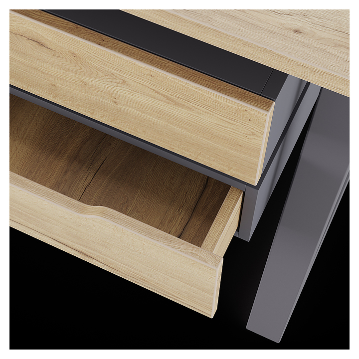 Офисный стол Кобор TR-160/60 graphite/natural используется в офисных помещениях и кабинетах руководителей. Модель оснащена опорами в форме трапеции. Каркас выполнен из металла, выкрашенного в цвет графит муар (RAL7024), столешница – из ламинированной древесно-стружечной плиты (ЛДСП) цвета натуральный дуб (H1180 ST37). Опции (заказываются отдельно):