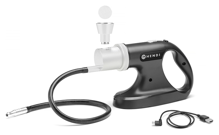 Коптильный пистолет HENDI 199640 предназначен для окуривания холодным и ароматным дымом мяса, морепродуктов, салатов, овощей, закусок, десертов, маринадов, соусов, супов, коктейлей и других продуктов и напитков любой плотности и консистенции на предприятиях общественного питания и торговли, а также в домашних условиях. Модель оснащена съемным сетчатым фильтром и удобной ручкой для простого использования одной рукой. Корпус выполнен из ABS-пластика, камера вентилятора - из алюминия. В комплект входят запасные сетчатые фильтры, пинцет и USB-кабель для зарядки. Ароматические щепки и травы для копчения в комплект поставки не входят и приобретаются отдельно. Особенности: