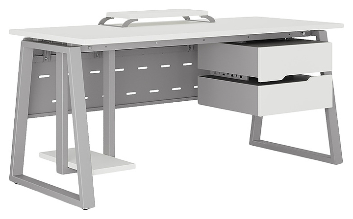 Офисный стол Кобор TR-160/60 aluminum/premium используется в офисных помещениях и кабинетах руководителей. Модель оснащена опорами в форме трапеции. Каркас выполнен из металла, выкрашенного в цвет алюминиевый металлик (RAL9006), столешница – из ламинированной древесно-стружечной плиты (ЛДСП) цвета белый премиум (W1000 ST9). Опции (заказываются отдельно):
