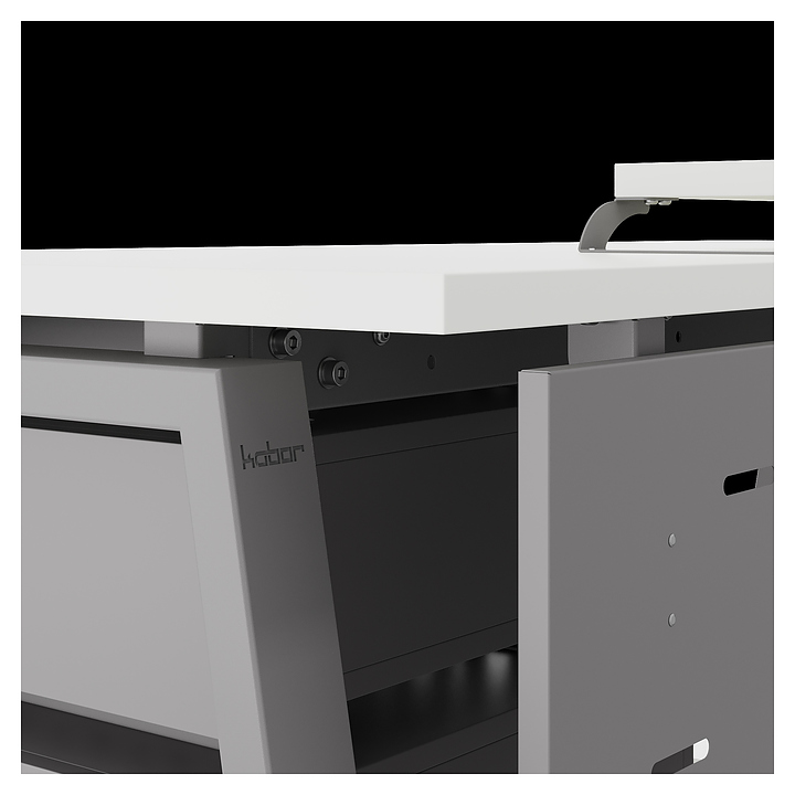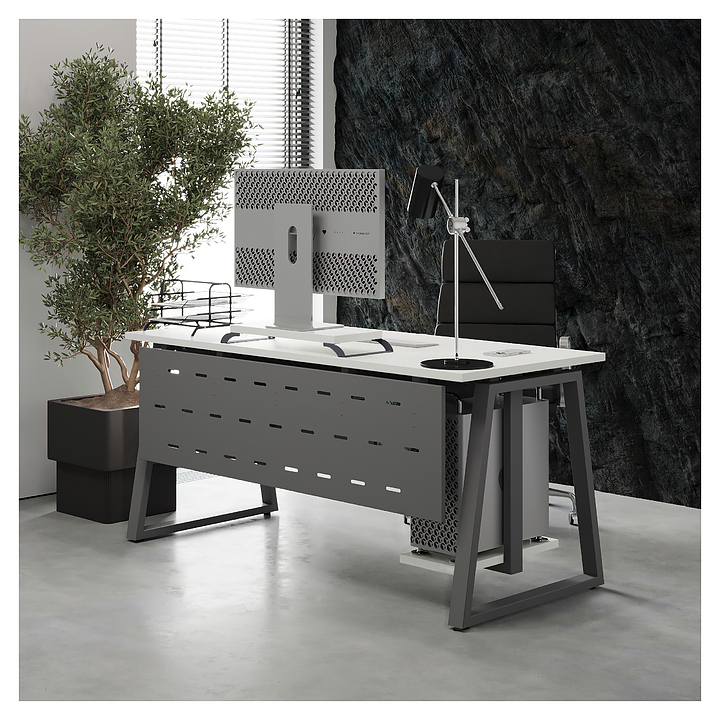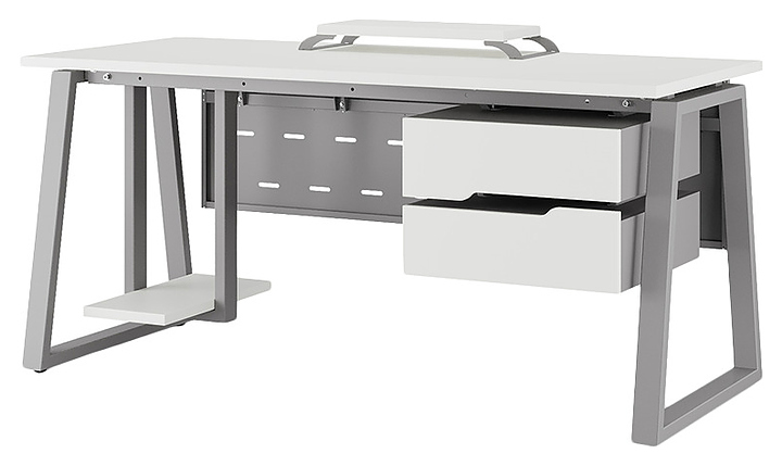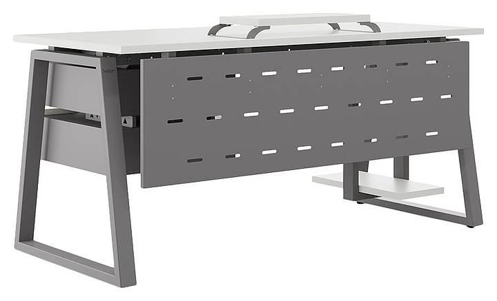 Офисный стол Кобор TR-180/60 aluminum/premium используется в офисных помещениях и кабинетах руководителей. Модель оснащена опорами в форме трапеции. Каркас выполнен из металла, выкрашенного в цвет алюминиевый металлик (RAL9006), столешница – из ламинированной древесно-стружечной плиты (ЛДСП) цвета белый премиум (W1000 ST9). Опции (заказываются отдельно):
