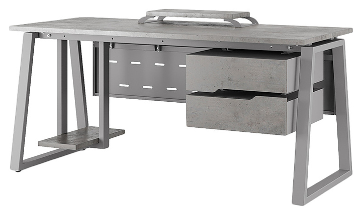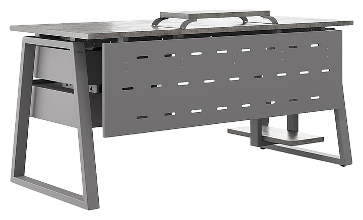 Офисный стол Кобор TR-120/80 aluminum/chicago используется в офисных помещениях и кабинетах руководителей. Модель оснащена опорами в форме трапеции. Каркас выполнен из металла, выкрашенного в цвет алюминиевый металлик (RAL9006), столешница – из ламинированной древесно-стружечной плиты (ЛДСП) цвета бетон чикаго (F186 ST9). Опции (заказываются отдельно):
