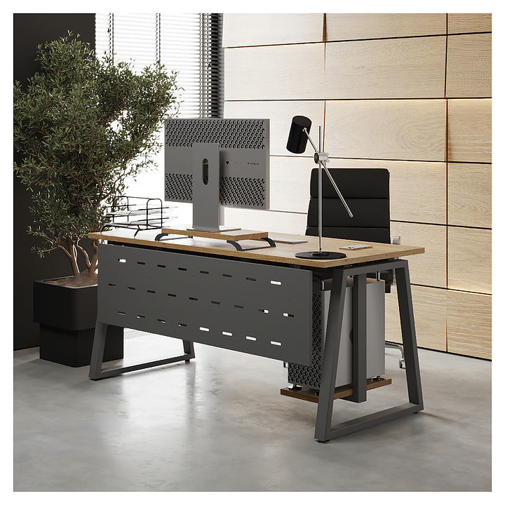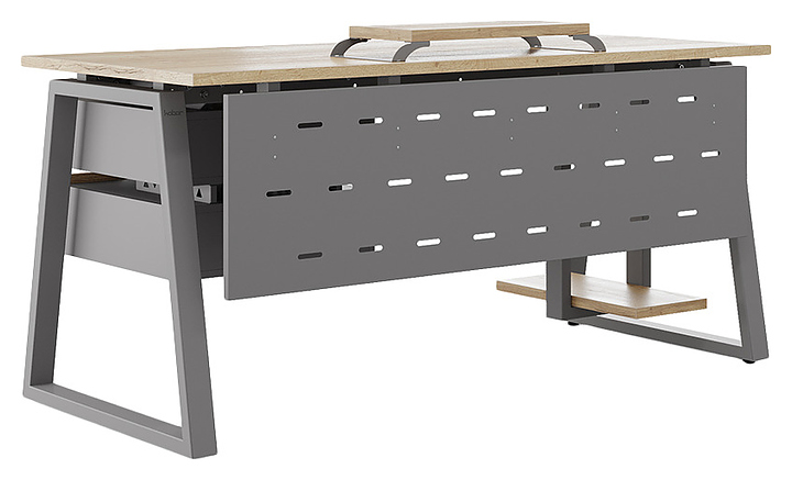Офисный стол Кобор TR-140/80 aluminum/natural используется в офисных помещениях и кабинетах руководителей. Модель оснащена опорами в форме трапеции. Каркас выполнен из металла, выкрашенного в цвет алюминиевый металлик (RAL9006), столешница – из ламинированной древесно-стружечной плиты (ЛДСП) цвета натуральный дуб (H1180 ST37). Опции (заказываются отдельно):