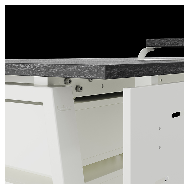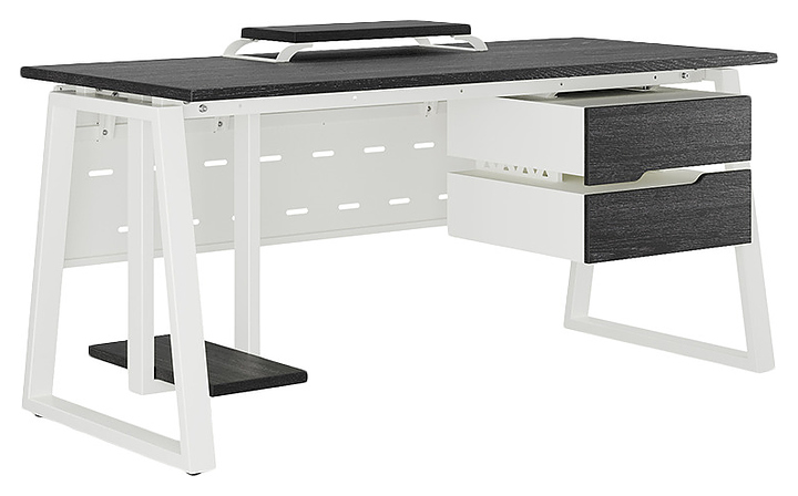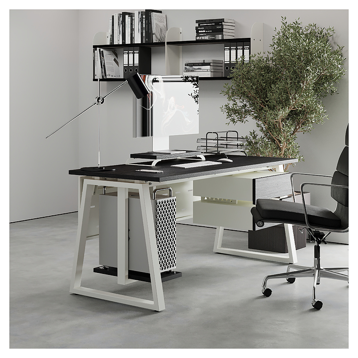 Офисный стол Кобор TR-160/70 white/glazed используется в офисных помещениях и кабинетах руководителей. Модель оснащена опорами в форме трапеции. Каркас выполнен из металла, выкрашенного в цвет белый муар (RAL9016), столешница – из ламинированной древесно-стружечной плиты (ЛДСП) цвета черный дуб (H3178 ST37). Опции (заказываются отдельно):