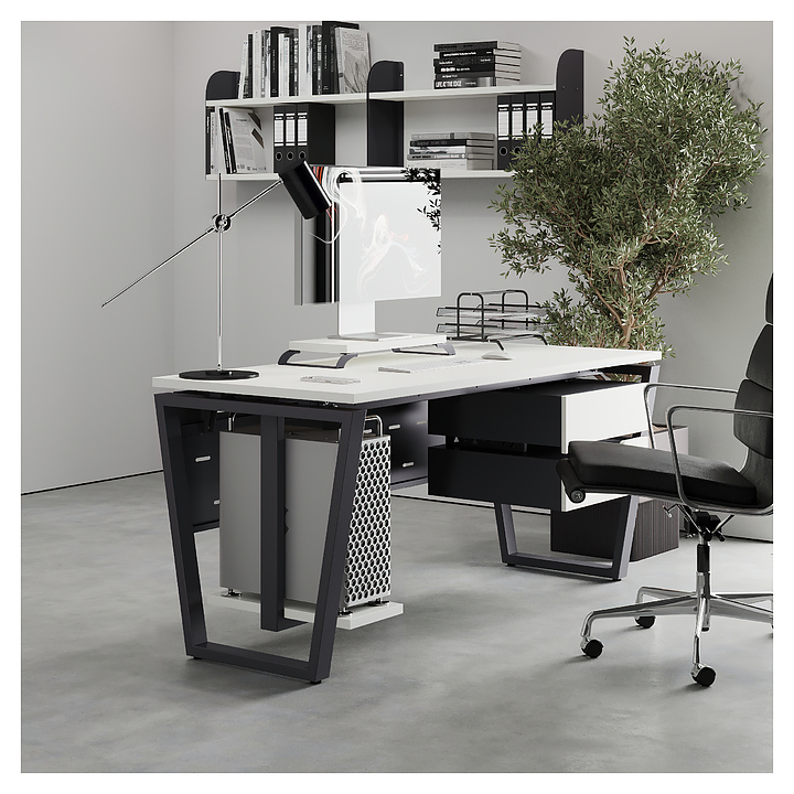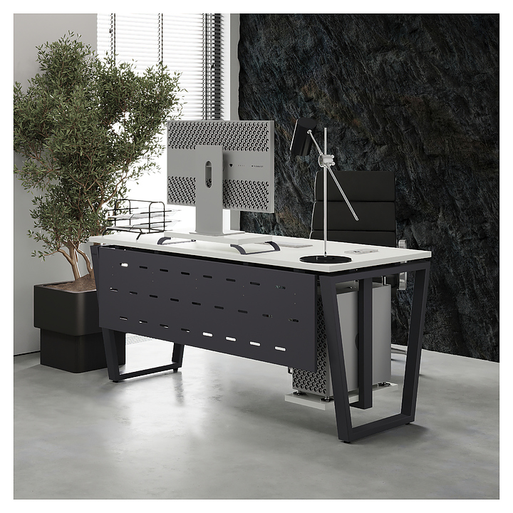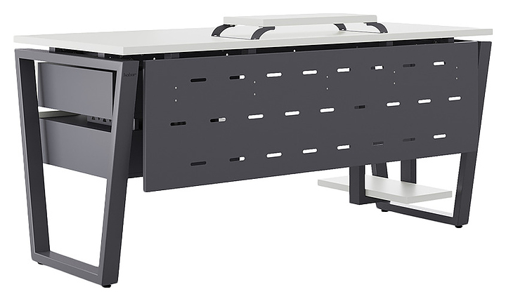 Офисный стол Кобор OTR-120/70 graphite/premium используется в офисных помещениях и кабинетах руководителей. Модель оснащена опорами в форме обратной трапеции. Каркас выполнен из металла, выкрашенного в цвет графит муар (RAL7024), столешница – из ламинированной древесно-стружечной плиты (ЛДСП) цвета белый премиум (W1000 ST9). Опции (заказываются отдельно):