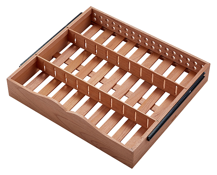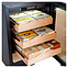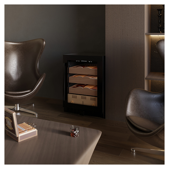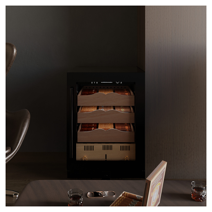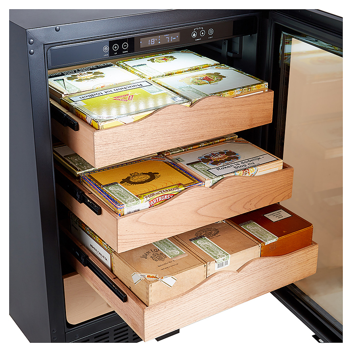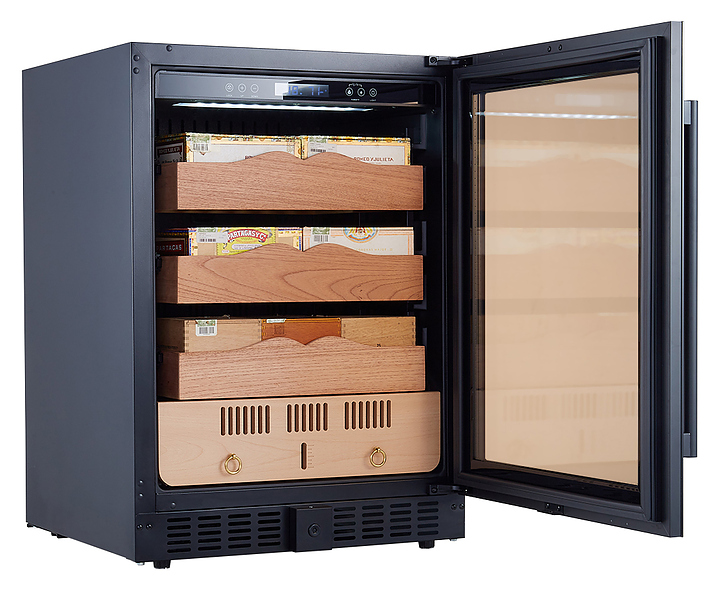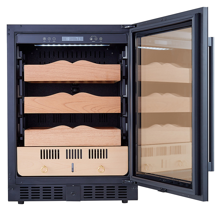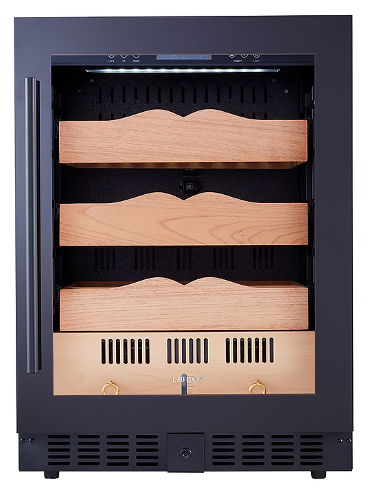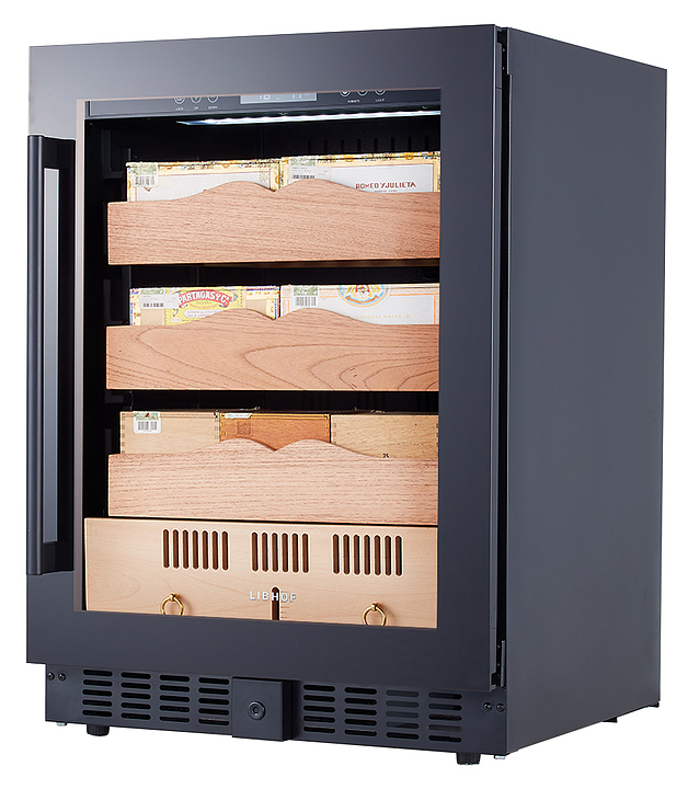 Сигарный шкаф Libhof BR-650 предназначен для хранения в оптимальных условиях и демонстрации табачных изделий в специализированных магазинах, гостиницах, складских помещениях, а также домашних условиях. Модель оснащена сенсорной панелью управления с дисплеем, распашной дверью на внутренних петлях и вентилятором. Корпус выполнен из металла, дверь - из антиультрафиолетового стеклопакета дымчатого цвета, полки - из натурального испанского кедра. В комплект поставки входят 3 телескопические полки, резервуар для воды, погружной увлажнитель и комплект ключей замка. Особенности: