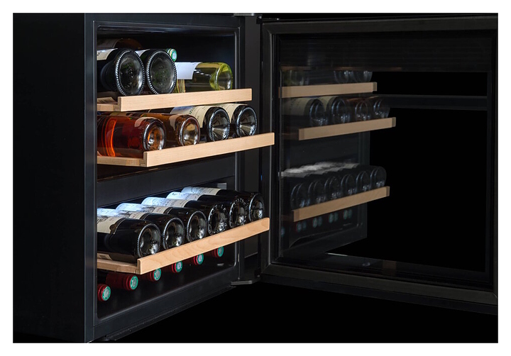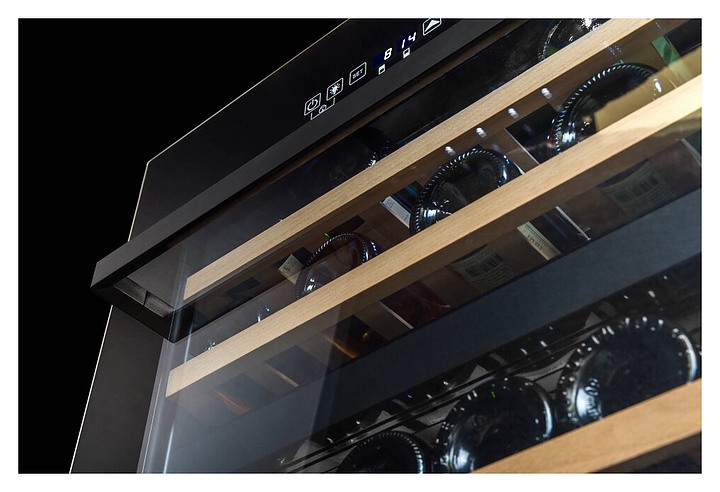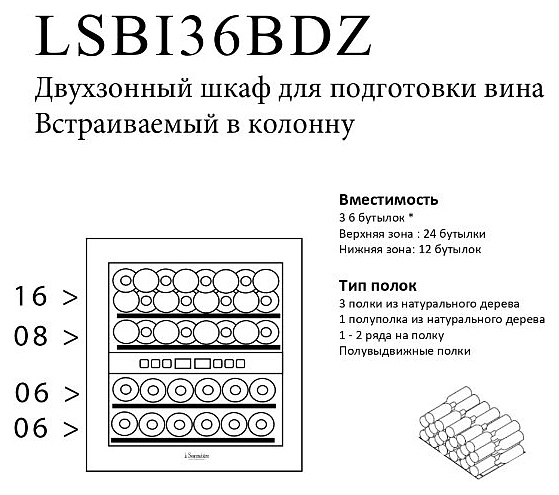Винный шкаф La Sommeliere LSBI36BDZ предназначен для хранения бутилированного вина в ресторанах, специализированных магазинах, подсобных складских помещениях, в частных домах или квартирах. Модель оснащена сенсорным белым цифровым дисплеем с электронным термометром, белой светодиодной подсветкой, 3 полувидвижными полками, 1 полуполкой и 4 регулируемыми ножками. Дверь выполнена из двойного закаленного стеклопакета с защитой от УФ-излучений, полки - из бука. Особенности: