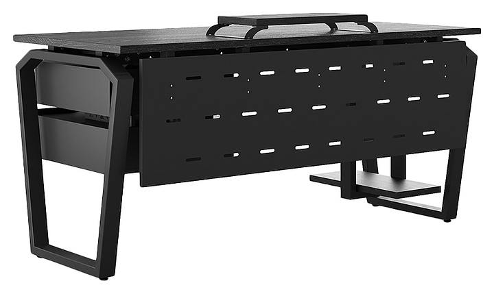 Офисный стол Кобор TB-180/80 black/glazed используется в офисных помещениях и кабинетах руководителей. Модель оснащена опорами в форме обратной трапеции со скошенными верхними углами. Каркас выполнен из металла, выкрашенного в цвет черный муар (RAL9005), столешница – из ламинированной древесно-стружечной плиты (ЛДСП) цвета черный дуб (H3178 ST37). Опции (заказываются отдельно):