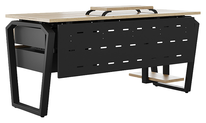 Офисный стол Кобор TB-160/60 black/natural используется в офисных помещениях и кабинетах руководителей. Модель оснащена опорами в форме обратной трапеции со скошенными верхними углами. Каркас выполнен из металла, выкрашенного в цвет черный муар (RAL9005), столешница – из ламинированной древесно-стружечной плиты (ЛДСП) цвета натуральный дуб (H1180 ST37). Опции (заказываются отдельно):