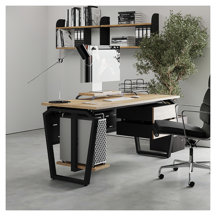 Офисный стол Кобор TB-80/80 black/natural используется в офисных помещениях и кабинетах руководителей. Модель оснащена опорами в форме обратной трапеции со скошенными верхними углами. Каркас выполнен из металла, выкрашенного в цвет черный муар (RAL9005), столешница – из ламинированной древесно-стружечной плиты (ЛДСП) цвета натуральный дуб (H1180 ST37). Опции (заказываются отдельно):