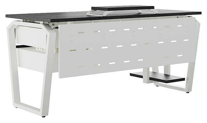 Офисный стол Кобор TB-160/80 white/glazed используется в офисных помещениях и кабинетах руководителей. Модель оснащена опорами в форме обратной трапеции со скошенными верхними углами. Каркас выполнен из металла, выкрашенного в цвет белый муар (RAL9016), столешница – из ламинированной древесно-стружечной плиты (ЛДСП) цвета черный дуб (H3178 ST37). Опции (заказываются отдельно):