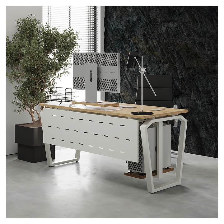 Офисный стол Кобор TB-80/60 white/natural используется в офисных помещениях и кабинетах руководителей. Модель оснащена опорами в форме обратной трапеции со скошенными верхними углами. Каркас выполнен из металла, выкрашенного в цвет белый муар (RAL9016), столешница – из ламинированной древесно-стружечной плиты (ЛДСП) цвета натуральный дуб (H1180 ST37). Опции (заказываются отдельно):