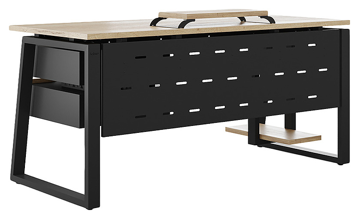 Офисный стол Кобор TS1-160/70 black/natural используется в офисных помещениях и кабинетах руководителей. Модель оснащена опорами в форме наклонной трапеции. Каркас выполнен из металла, выкрашенного в цвет черный муар (RAL9005), столешница – из ламинированной древесно-стружечной плиты (ЛДСП) цвета натуральный дуб (H1180 ST37). Опции (заказываются отдельно):