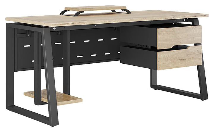 Офисный стол Кобор TS1-180/70 black/natural используется в офисных помещениях и кабинетах руководителей. Модель оснащена опорами в форме наклонной трапеции. Каркас выполнен из металла, выкрашенного в цвет черный муар (RAL9005), столешница – из ламинированной древесно-стружечной плиты (ЛДСП) цвета натуральный дуб (H1180 ST37). Опции (заказываются отдельно):