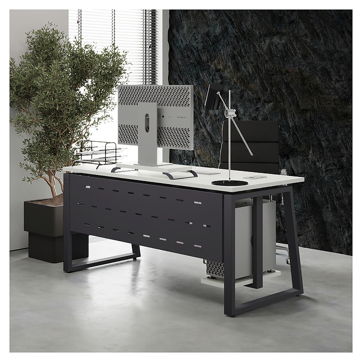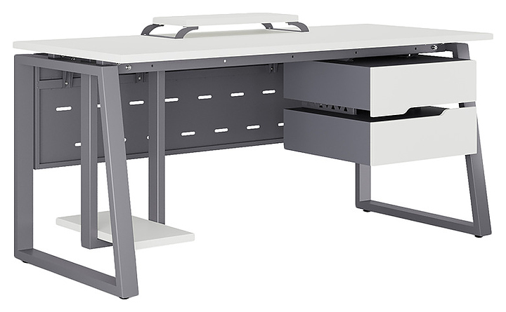 Офисный стол Кобор TS1-120/80 graphite/premium используется в офисных помещениях и кабинетах руководителей. Модель оснащена опорами в форме наклонной трапеции. Каркас выполнен из металла, выкрашенного в цвет графит муар (RAL7024), столешница – из ламинированной древесно-стружечной плиты (ЛДСП) цвета белый премиум (W1000 ST9). Опции (заказываются отдельно):