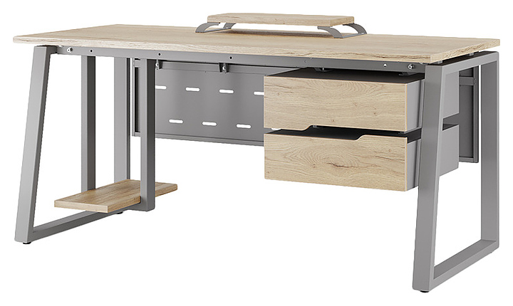 Офисный стол Кобор TS1-120/80 aluminum/natural используется в офисных помещениях и кабинетах руководителей. Модель оснащена опорами в форме наклонной трапеции. Каркас выполнен из металла, выкрашенного в цвет алюминиевый металлик (RAL9006), столешница – из ламинированной древесно-стружечной плиты (ЛДСП) цвета натуральный дуб (H1180 ST37). Опции (заказываются отдельно):