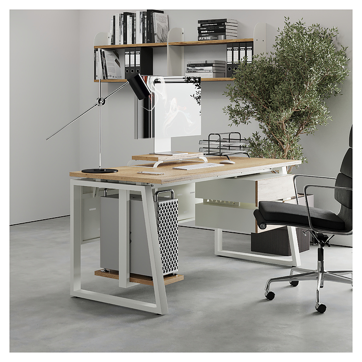 Офисный стол Кобор TS1-140/60 white/natural используется в офисных помещениях и кабинетах руководителей. Модель оснащена опорами в форме наклонной трапеции. Каркас выполнен из металла, выкрашенного в цвет белый муар (RAL9016), столешница – из ламинированной древесно-стружечной плиты (ЛДСП) цвета натуральный дуб (H1180 ST37). Опции (заказываются отдельно):