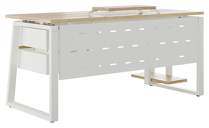 Офисный стол Кобор TS1-140/80 white/natural используется в офисных помещениях и кабинетах руководителей. Модель оснащена опорами в форме наклонной трапеции. Каркас выполнен из металла, выкрашенного в цвет белый муар (RAL9016), столешница – из ламинированной древесно-стружечной плиты (ЛДСП) цвета натуральный дуб (H1180 ST37). Опции (заказываются отдельно):