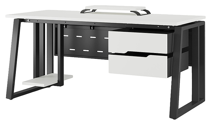 Офисный стол Кобор TS2-100/60 black/premium используется в офисных помещениях и кабинетах руководителей. Модель оснащена усиленными вертикальными балками опорами в форме наклонной трапеции. Каркас выполнен из металла, выкрашенного в цвет черный муар (RAL9005), столешница – из ламинированной древесно-стружечной плиты (ЛДСП) цвета белый премиум (W1000 S9). Опции (заказываются отдельно):