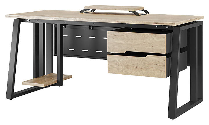 Офисный стол Кобор TS2-100/70 black/natural используется в офисных помещениях и кабинетах руководителей. Модель оснащена усиленными вертикальными балками опорами в форме наклонной трапеции. Каркас выполнен из металла, выкрашенного в цвет черный муар (RAL9005), столешница – из ламинированной древесно-стружечной плиты (ЛДСП) цвета натуральный дуб (H1180 ST37). Опции (заказываются отдельно):
