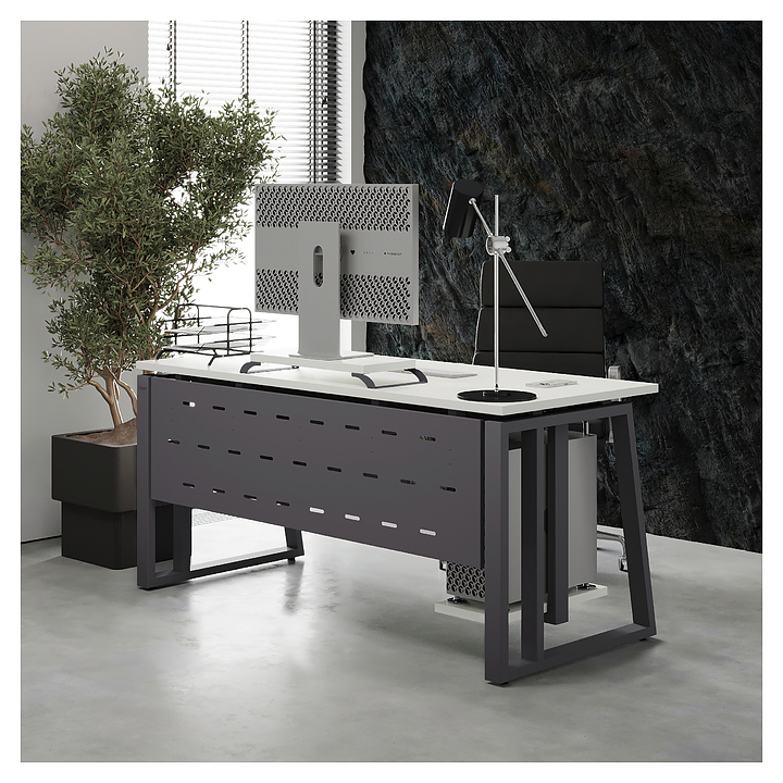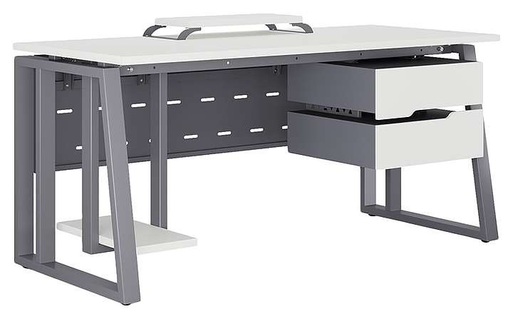 Офисный стол Кобор TS2-160/80 graphite/premium используется в офисных помещениях и кабинетах руководителей. Модель оснащена усиленными вертикальными балками опорами в форме наклонной трапеции. Каркас выполнен из металла, выкрашенного в цвет графит муар (RAL7024), столешница – из ламинированной древесно-стружечной плиты (ЛДСП) цвета белый премиум (W1000 ST9). Опции (заказываются отдельно):