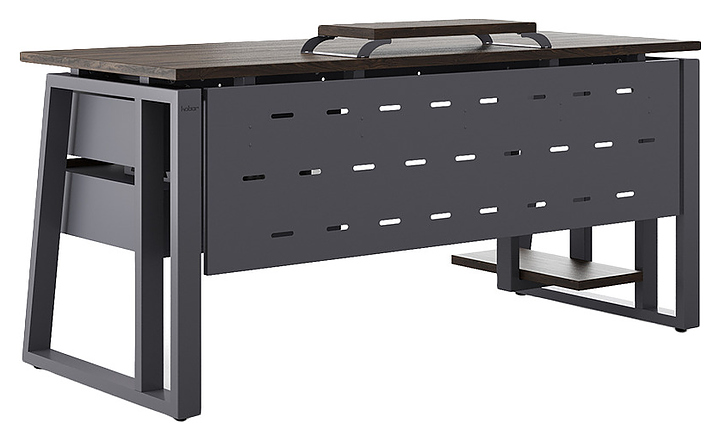 Офисный стол Кобор TS2-100/60 graphite/charlston используется в офисных помещениях и кабинетах руководителей. Модель оснащена усиленными вертикальными балками опорами в форме наклонной трапеции. Каркас выполнен из металла, выкрашенного в цвет графит муар (RAL7024), столешница – из ламинированной древесно-стружечной плиты (ЛДСП) цвета дуб чарльстон (H3154 ST36). Опции (заказываются отдельно):