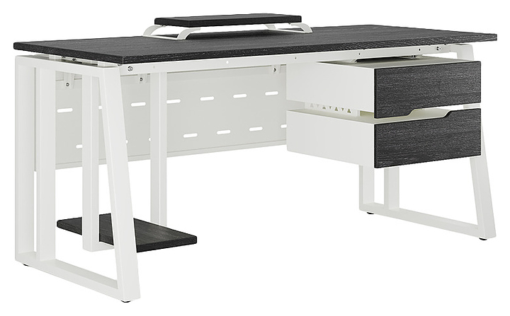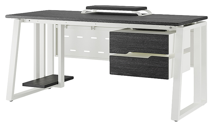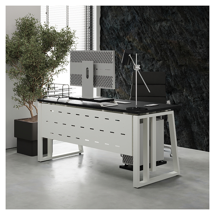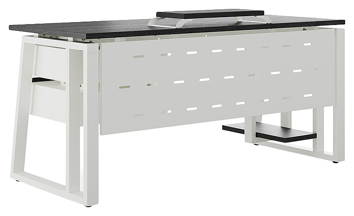 Офисный стол Кобор TS2-120/60 white/glazed используется в офисных помещениях и кабинетах руководителей. Модель оснащена усиленными вертикальными балками опорами в форме наклонной трапеции. Каркас выполнен из металла, выкрашенного в цвет белый муар (RAL9016), столешница – из ламинированной древесно-стружечной плиты (ЛДСП) цвета черный дуб (H3178 ST37). Опции (заказываются отдельно):