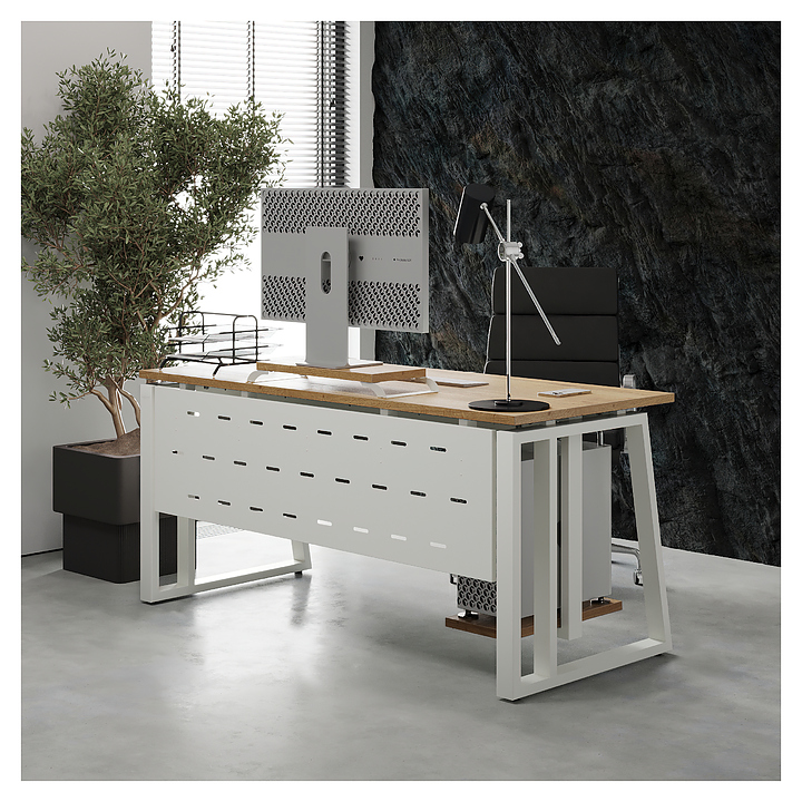 Офисный стол Кобор TS2-140/80 white/natural используется в офисных помещениях и кабинетах руководителей. Модель оснащена усиленными вертикальными балками опорами в форме наклонной трапеции. Каркас выполнен из металла, выкрашенного в цвет белый муар (RAL9016), столешница – из ламинированной древесно-стружечной плиты (ЛДСП) цвета натуральный дуб (H1180 ST37). Опции (заказываются отдельно):