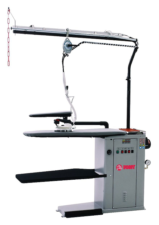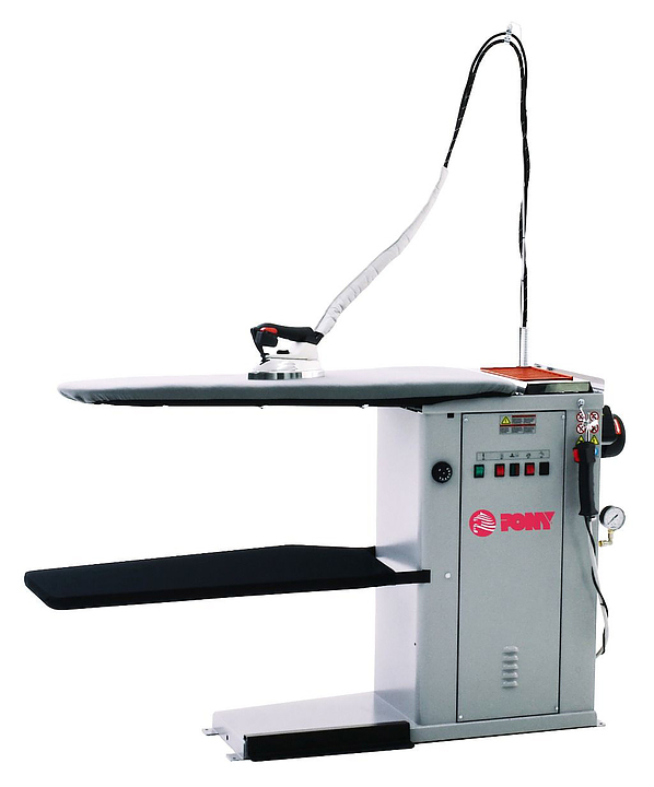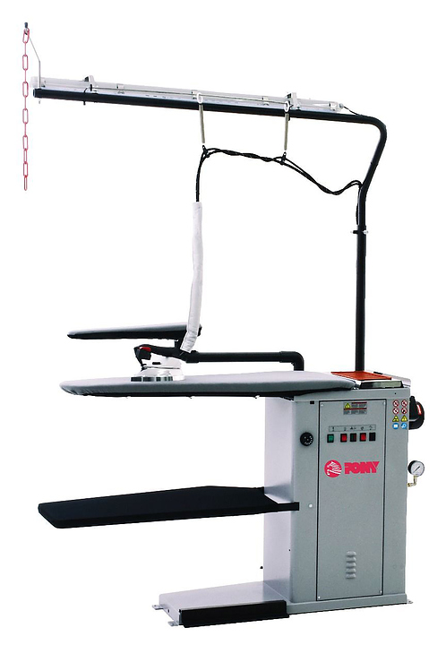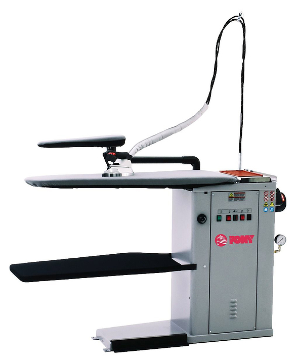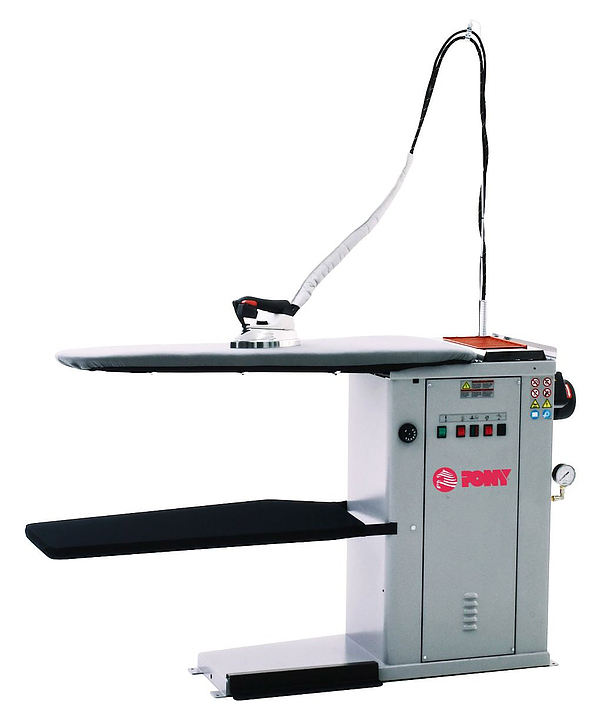 Гладильный стол PONY FVC используется в прачечных образовательных, оздоровительных заведениях, производственных предприятиях, в поликлиниках, гостиницах, детских садах, общежитиях, больницах, роддомах для глажения фасонного белья с помощью утюга. Стол оснащен паровым утюгом, аспиратором и встроенным автоматическим электрическим бойлером, который дает возможность питать от него второй утюг, расположенный на радом стоящем столе. Особенности: