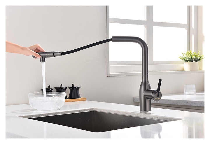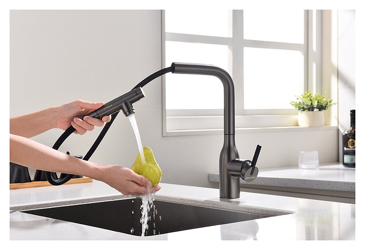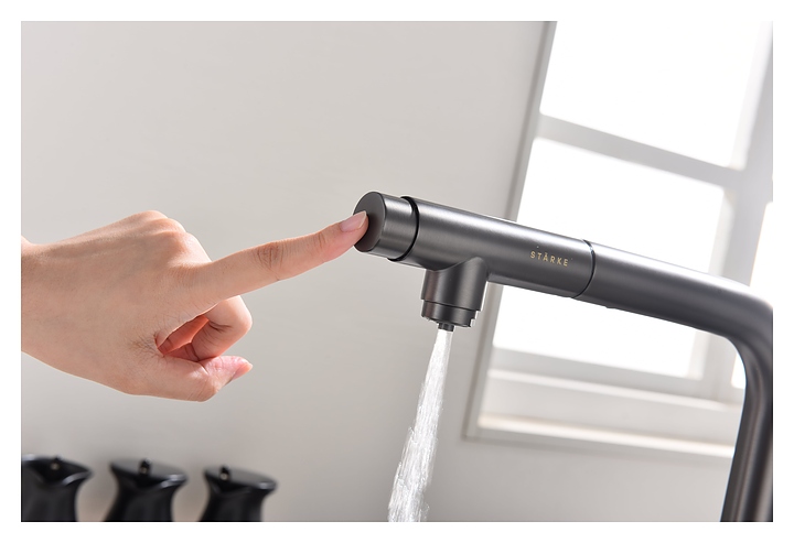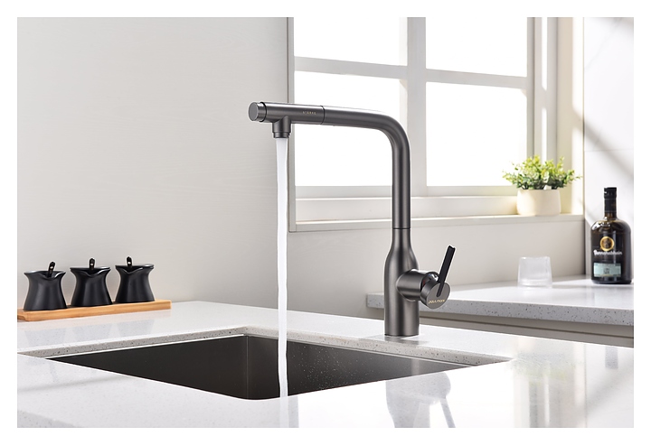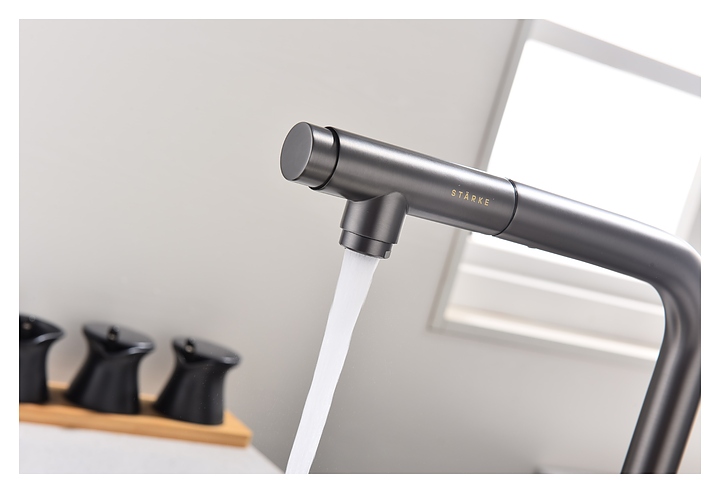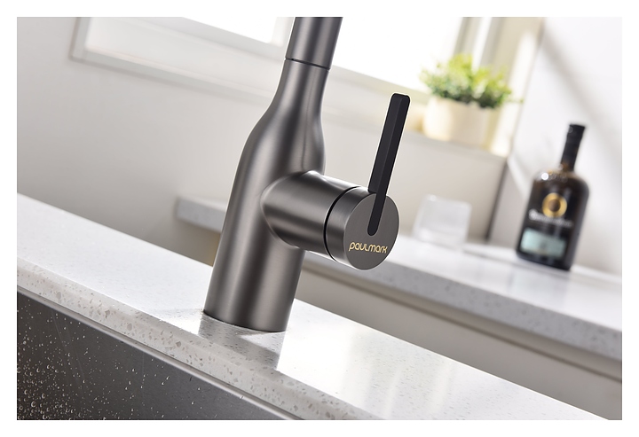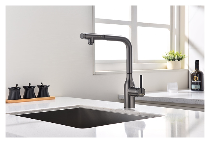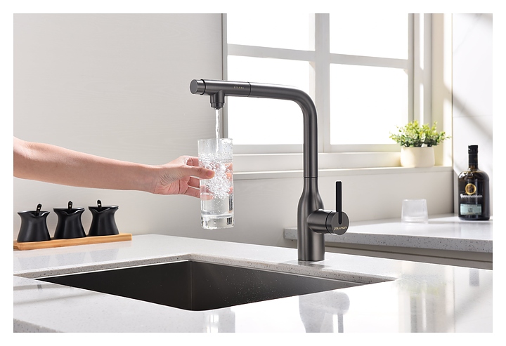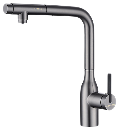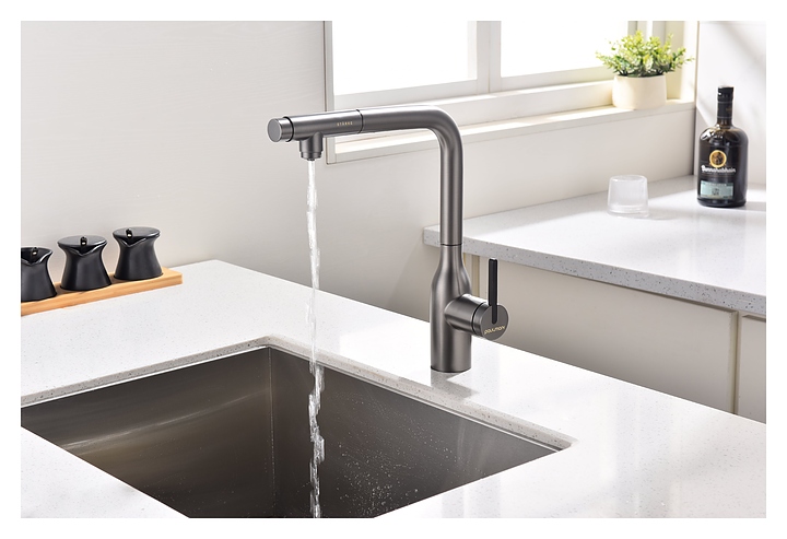 Смеситель Paulmark Viper Vi213105-B предназначен для подачи горячей и холодной воды в кухонных помещениях. Модель оснащена вытяжным изливом и керамическим картриджем, обеспечивающим плавный ход рычага смесителя, контроль и точность при выборе напора и температуры воды. Фильтрованная вода подается через отдельные трубку и аэратор, что исключает смешивание с водопроводной водой. Изделие выполнено из латуни, отличающейся прочностью, долговечностью и устойчивостью к перепадам температуры. Дополнительные характеристики: