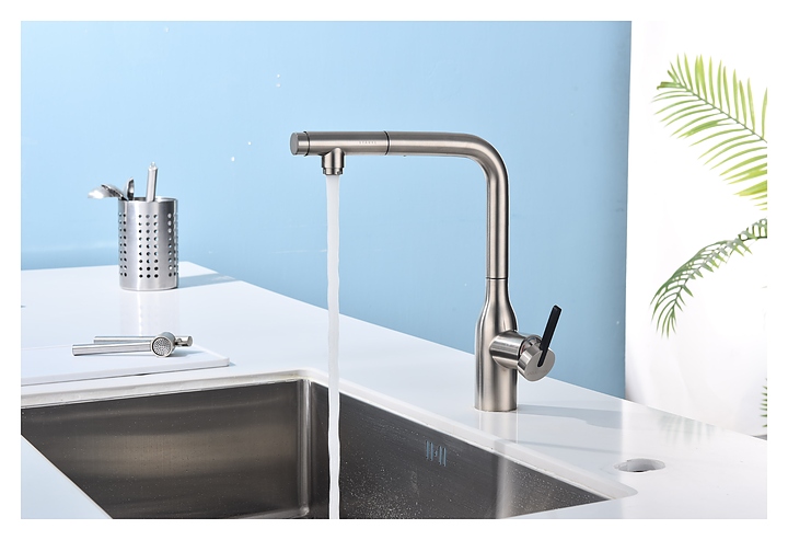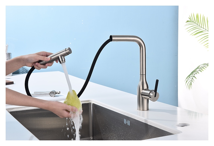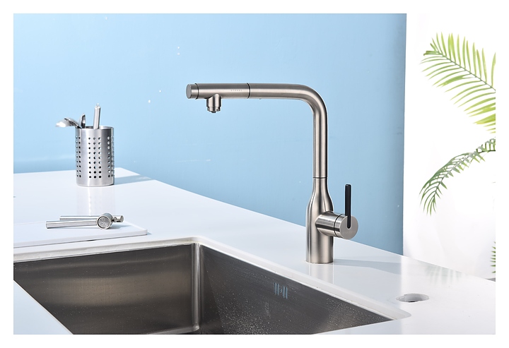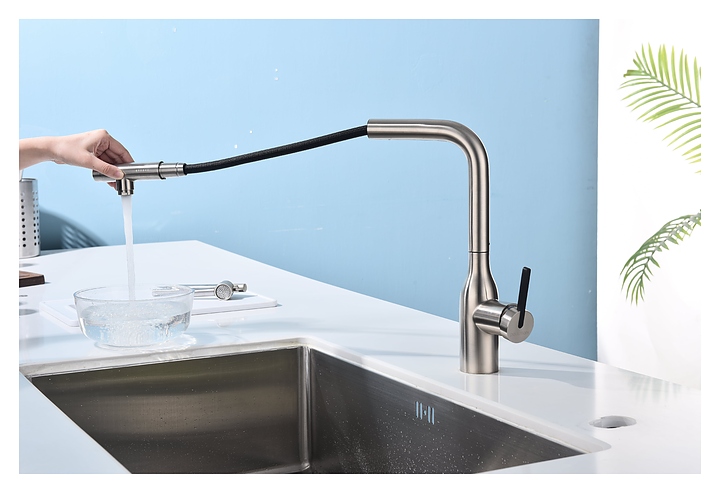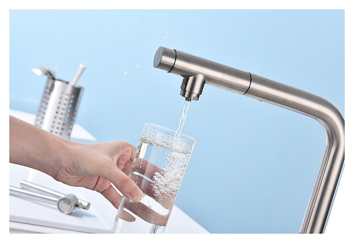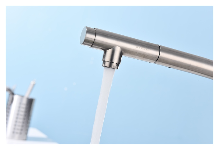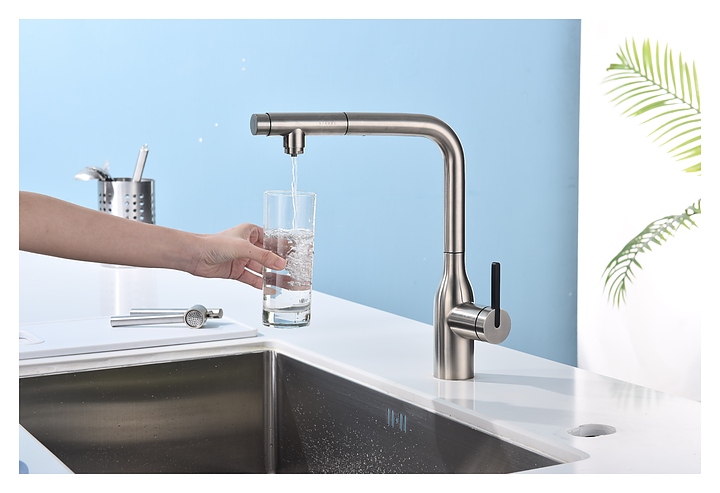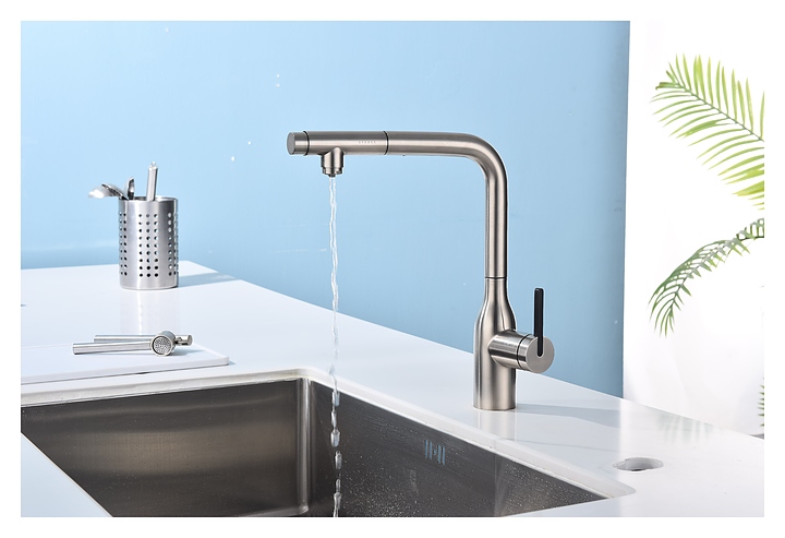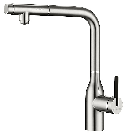 Смеситель Paulmark Viper Vi213106-NI предназначен для подачи горячей и холодной воды в кухонных помещениях. Модель оснащена вытяжным изливом и керамическим картриджем, обеспечивающим плавный ход рычага смесителя, контроль и точность при выборе напора и температуры воды. Фильтрованная вода подается через отдельные трубку и аэратор, что исключает смешивание с водопроводной водой. Изделие выполнено из латуни, отличающейся прочностью, долговечностью и устойчивостью к перепадам температуры. Дополнительные характеристики: