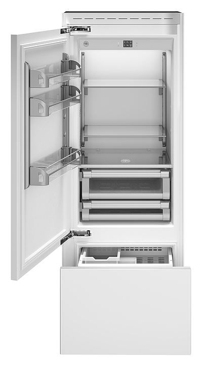 Холодильник Bertazzoni REF755BBLPTT предназначен для замораживания, охлаждения и хранения скоропортящихся продуктов и напитков в частных домах, квартирах, офисах и отелях. Возможность встраивания решает проблему ограниченного пространства. Модель оснащена холодильной камерой с 3 регулируемыми по высоте полками и 2 выдвижными ящиками, 3 полками на дверце, морозильной камерой с 2 ящиками, светодиодными лампами освещения и внутренней сенсорной панелью управления с цифровым дисплеем. Корпус выполнен из металла, полки - из стекла, внутренняя отделка камер - из белого алюминия, дверь - без отделки, предназначена для навески мебельных фасадов. Особенности: