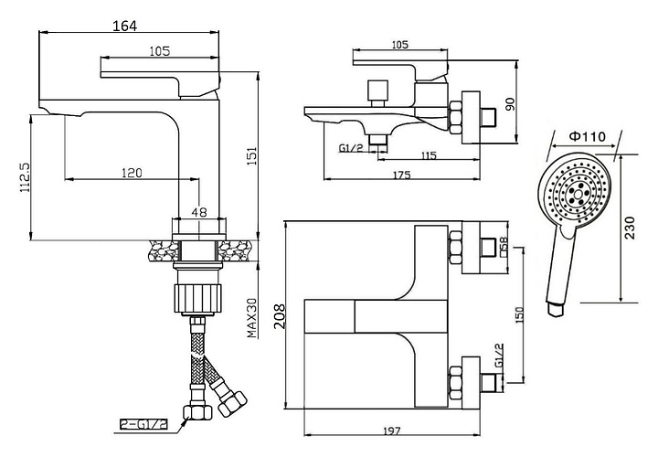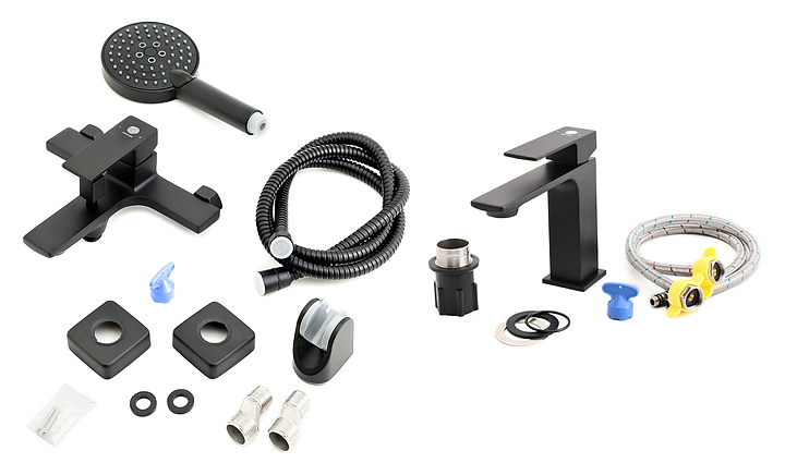 Набор ORANGE Lutz M04-311b предназначен для использования в ванных комнатах. Модель оснащена смесителем для раковины и ванны с душем, настенным держателем для ручного душа, ручной лейкой и шлангом в металлической оплетке с защитой от перекручивания, а также керамическим картриджем, обеспечивающим плавный ход рычага смесителя, контроль и точность при выборе напора и температуры воды, и аэратором для создания мягкой ровной струи без разбрызгивания. Изделие выполнено из латуни, отличающейся прочностью, долговечностью и устойчивостью к перепадам температуры, ABS-пластика и нержавеющей стали. В комплект поставки входят смеситель для раковины, смеситель для ванны с душем, держатель для ручного душа, ручная лейка, шланг и гибкая подводка. Особенности: