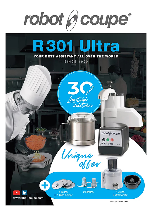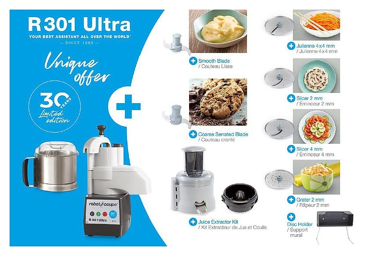 Кухонный процессор Robot Coupe R301 Ultra Anniversary используется на предприятиях общественного питания и торговли для всех видов нарезки, замешивания и измельчения продуктов питания. Насадка-овощерезка оснащена 2 воронками: большая - для нарезки крупных овощей как капуста и сельдерей, круглая - для длинных овощей. Аппарат представляет собой куттер и овощерезку в одном виде. Юбилейная серия, посвященная тридацтилетию компании Robot Coupe. В подарок 4 диска, зубчатый нож для куттера, насадка-соковыжималка. Комплектация: