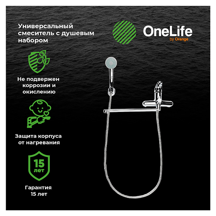 Смеситель для ванны и душа ORANGE 1Life (OneLife by Orange) P01-218cr предназначен для подачи горячей и холодной воды в ванных помещениях. Модель оснащена душевым гарнитуром, включающим в себя однорежимную ручную лейку с душевым шлангом и настенный держатель для душа, керамическим картриджем, обеспечивающим плавный ход рычага смесителя, контроль и точность при выборе напора и температуры воды, а также встроенным аэратором, который экономит воду, насыщает ее воздухом и создает мягкую струю без брызг. Изделие выполнено из запатентованного высокотехнологичного полимера. В комплект поставки входят смеситель, отражатели и эксцентрики. Особенности: