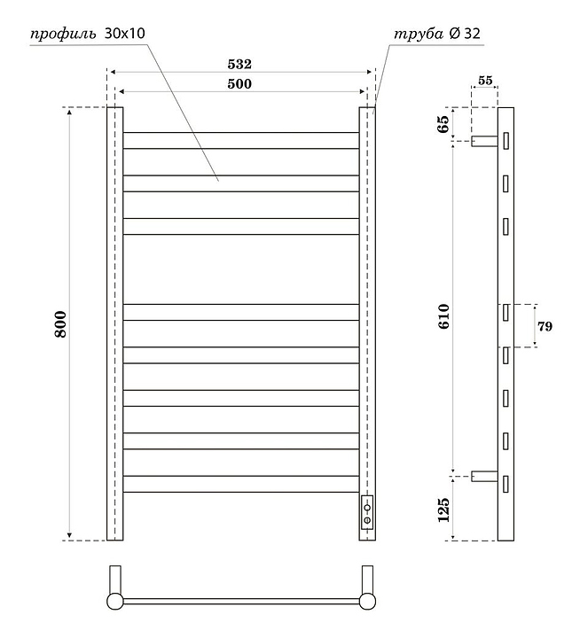 Электрический полотенцесушитель Point Селена PN16858B предназначен для подогрева и сушки полотенец, а также для обогрева ванных комнат в квартирах, коттеджах и частных домах. Модель оснащена таймером. Изделие выполнено из конструкционной стали, отличающейся прочностью, долговечностью и устойчивостью к коррозии. В комплект поставки входят кронштейны для крепления к стене, сетевой кабель и набор скрытого подключения. Особенности: